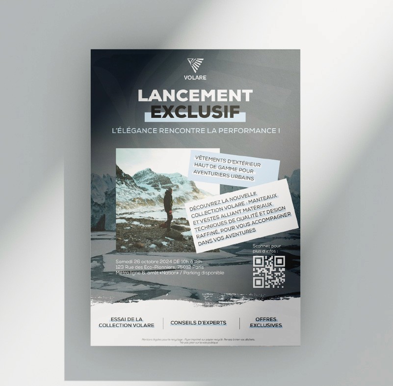 Une identité moderne, forte et facilement déclinable, accompagnée d’un flyer de lancement impactant, capable d’installer la marque et d’affirmer son positionnement dans l’univers outdoor.